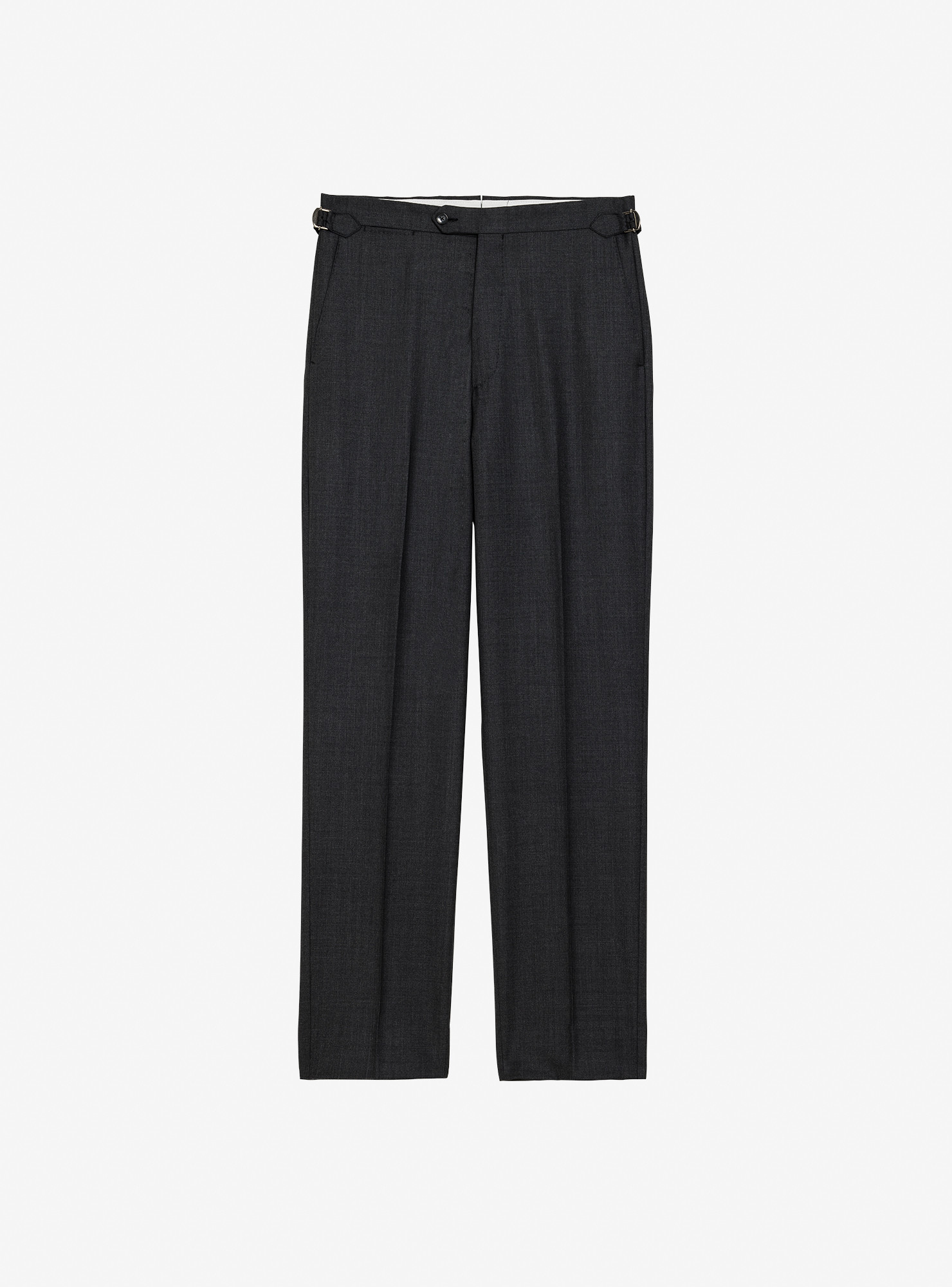 Costume 100% entoilé confectionné en Italie en Laine 150s. Montage traditionnel , épaules structurées, poches latérales à rabat droit, deux fentes dos, doublure intérieure entièrement doublée. Pantalon avec pattes de serrages, sans pince, bas sans revers.