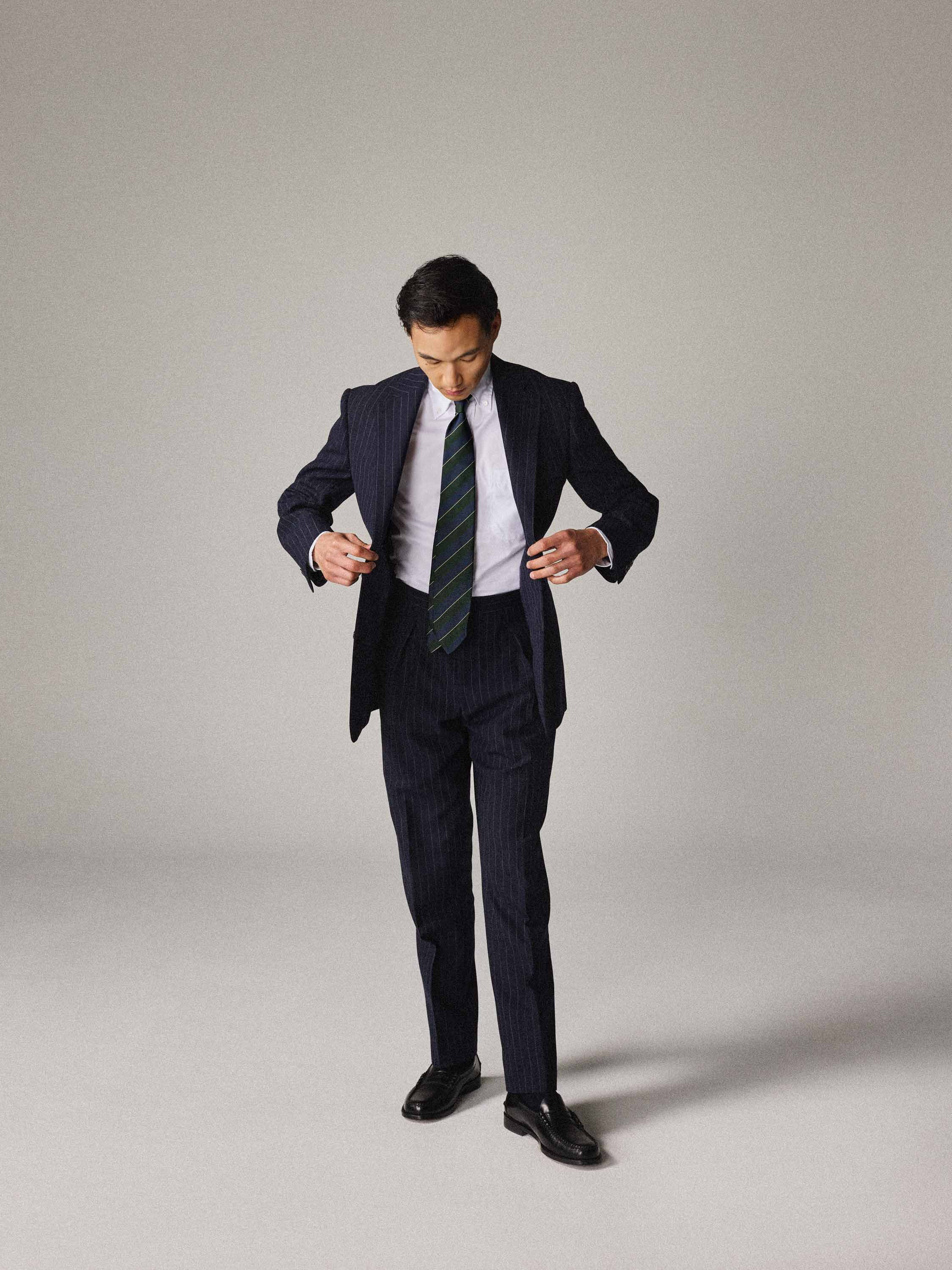Costume droit 2 boutons en Fresco à rayures craies. Montage traditionnel, épaules avec épaulettes structurées, poches latérales à rabats droits, 2 fentes dos, doublure intérieure semi doublée. Pantalon à pattes de serrages, 1 pinces intérieure, bas simple sans revers.