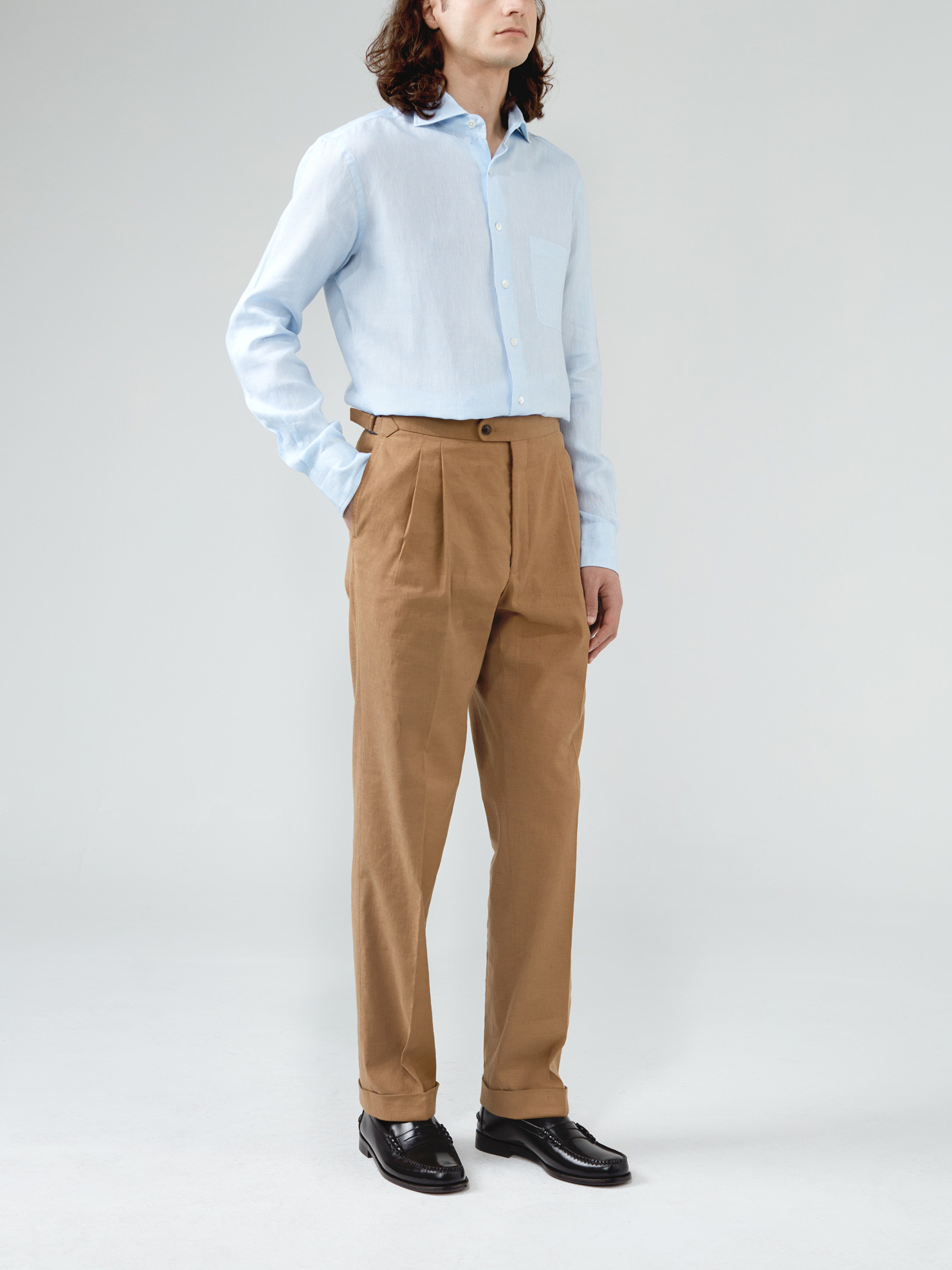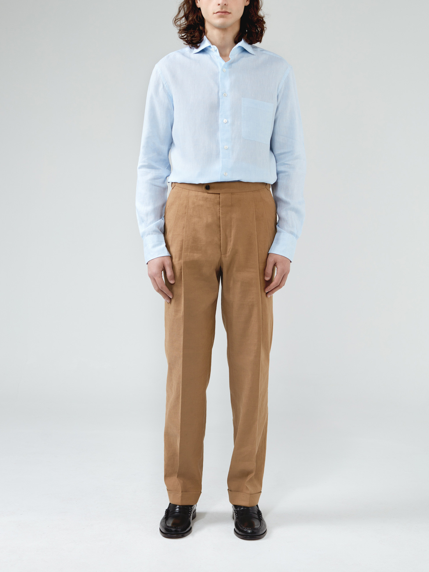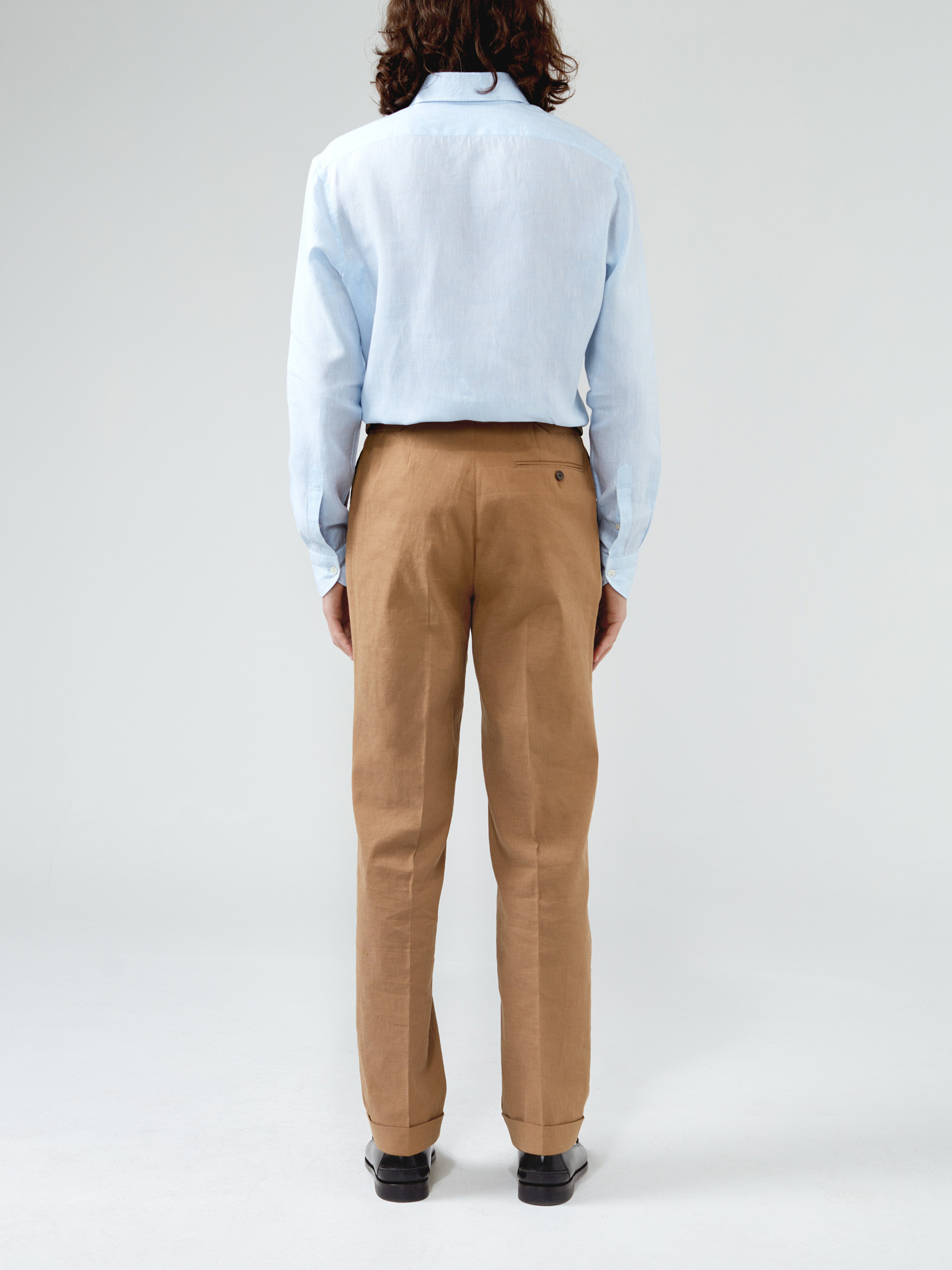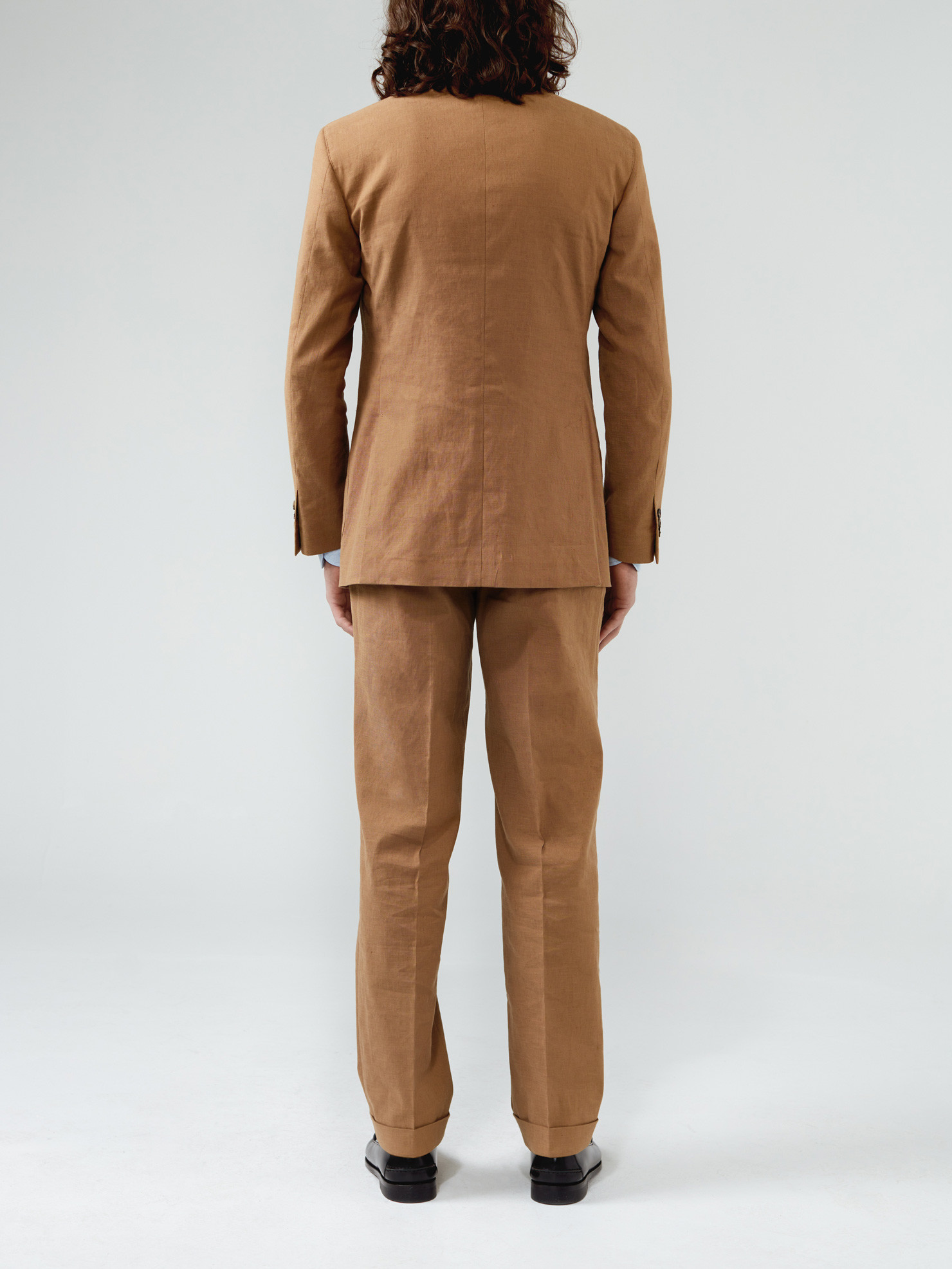 Costume Lin Camel - Veste croisée, fermeture à 6 boutons, col large, épaule soft, poche poitrine classique, poches latérales plaquée arrondie, semi doublée, deux fentes dos. Pantalon à pattes de serrage, deux pinces intérieures, poches latérales obliques, une seule poche à l'arrière à droite, bas revers 4cm.