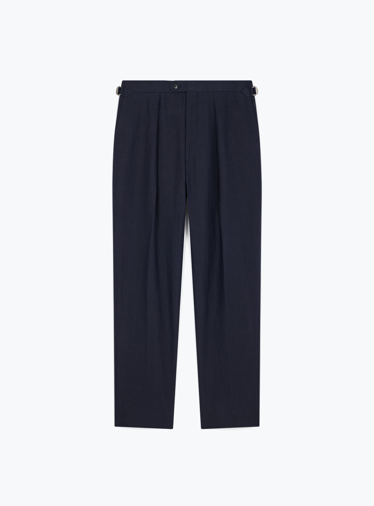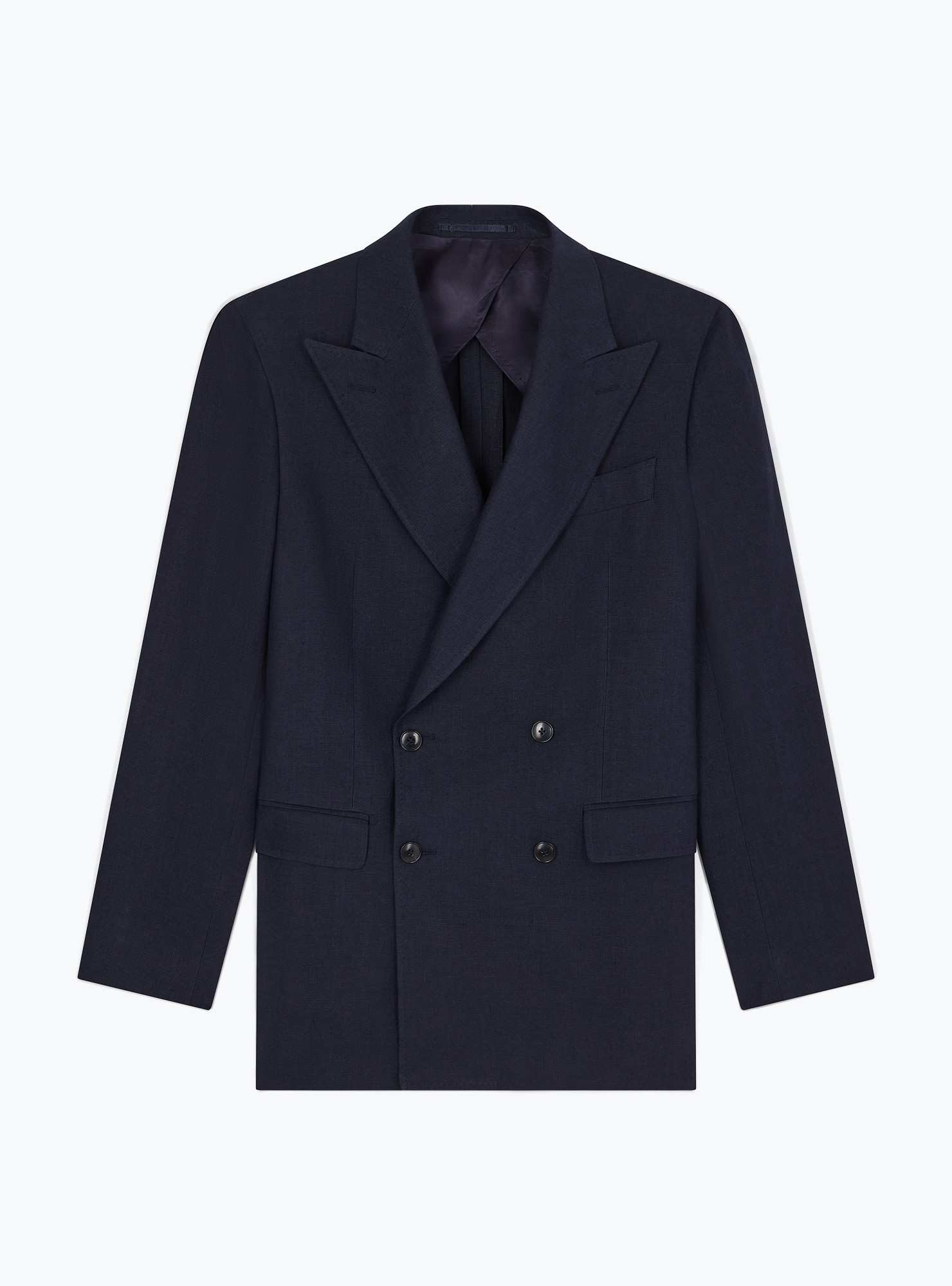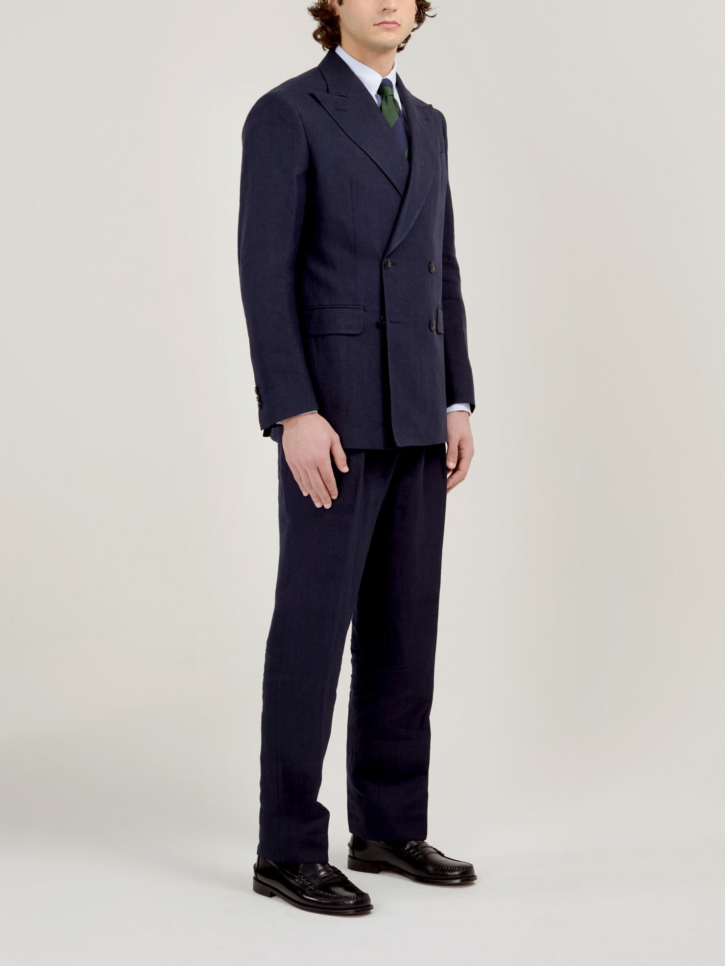 Costume croisé 4 boutons en Lin Marine. Montage traditionnel, épaules avec épaulettes souples, poches latérales à rabat droit, deux fentes dos, doublure intérieure semi doublée. Pantalon à pattes de serrage, une pince intérieure, bas sans revers.