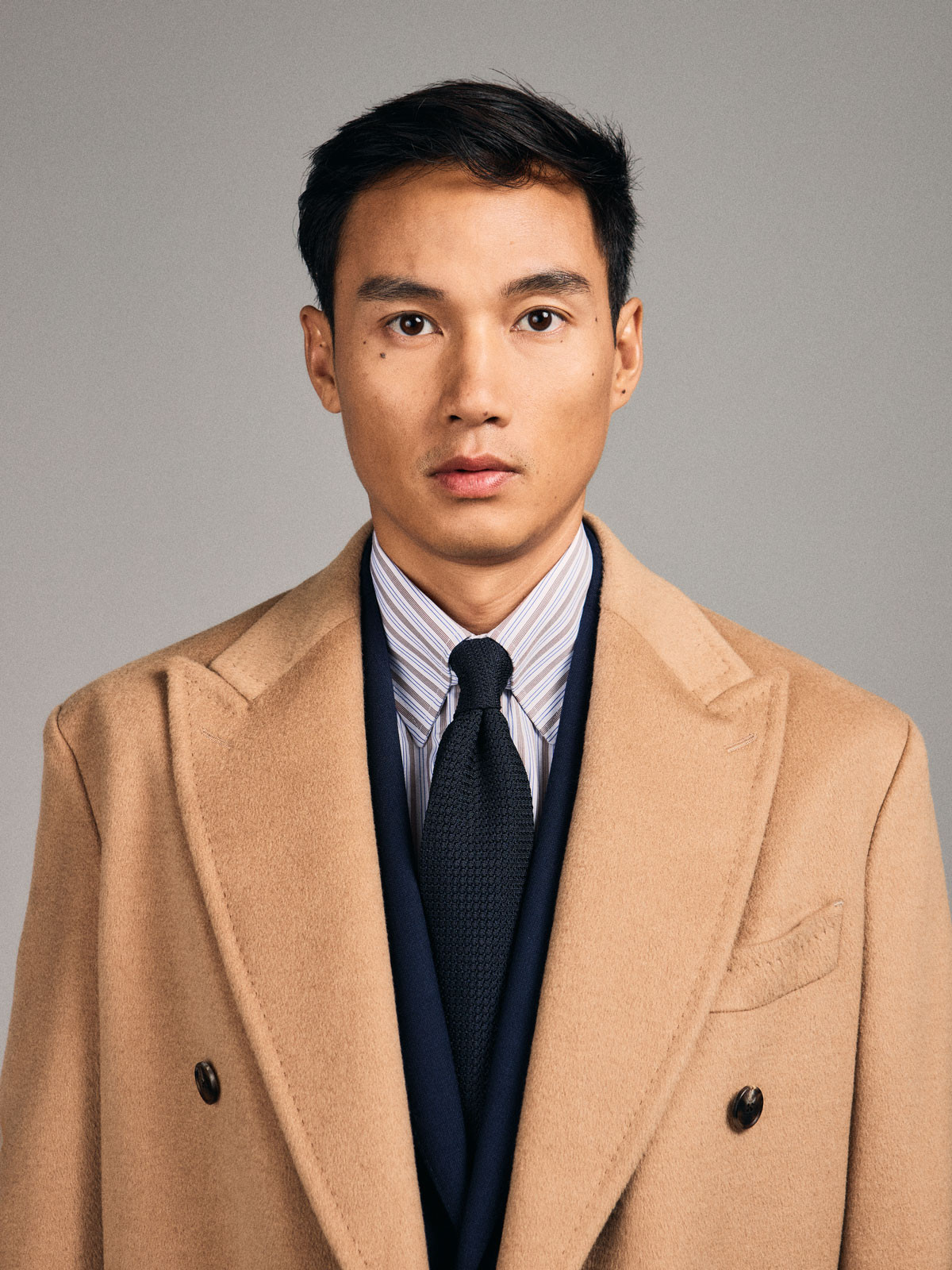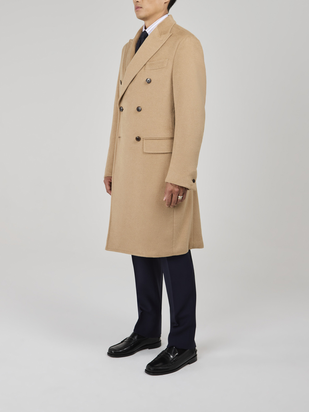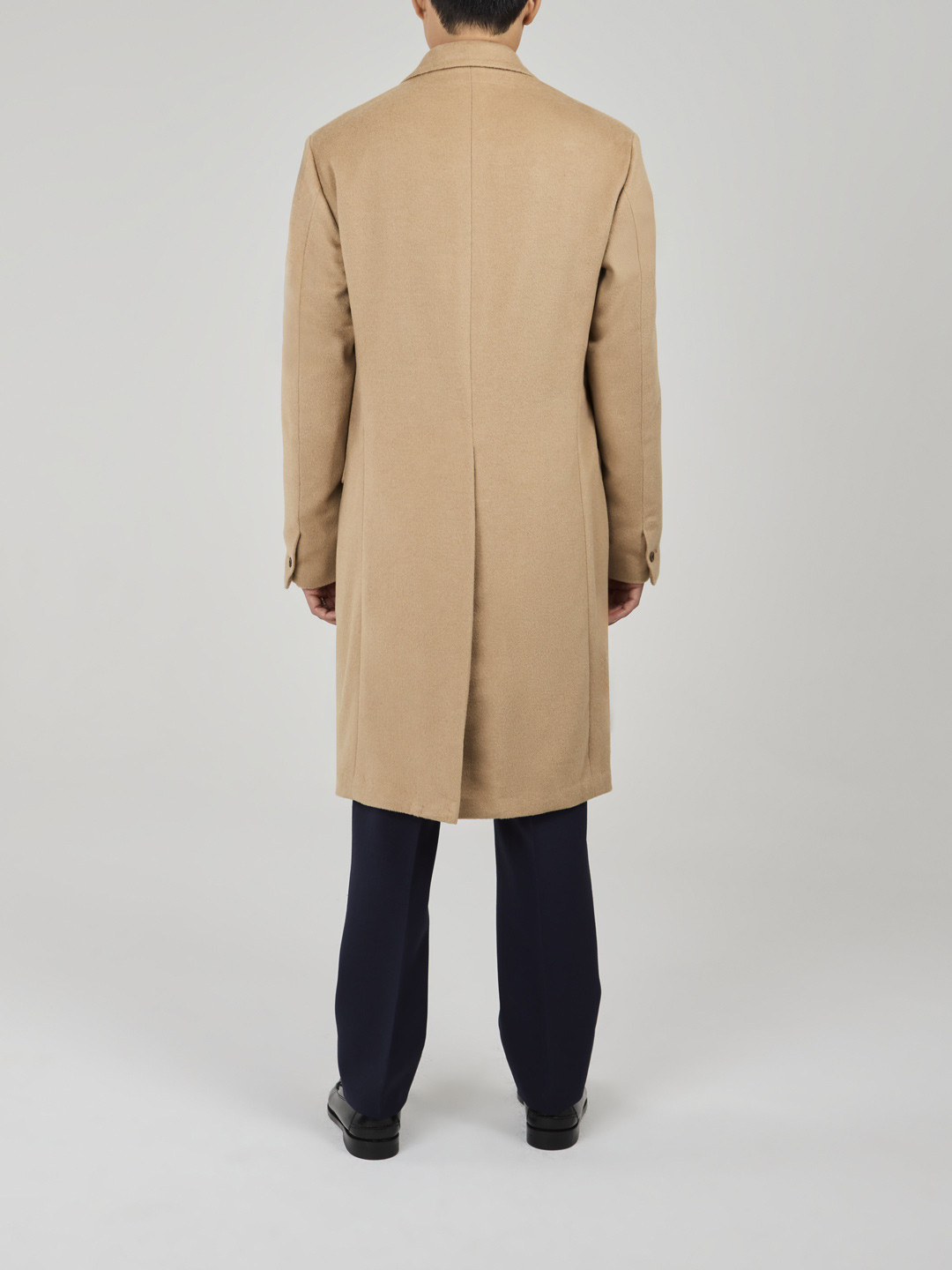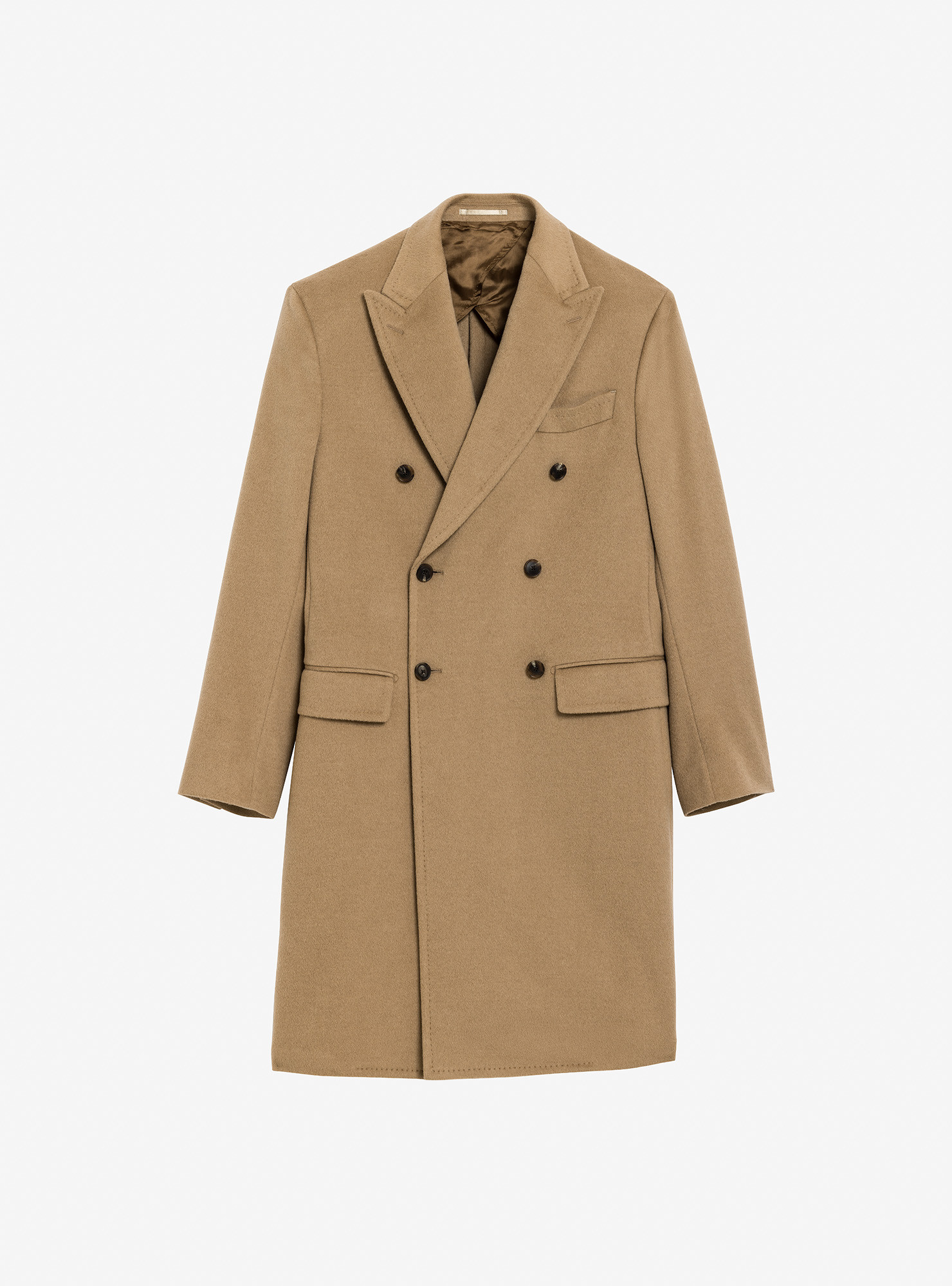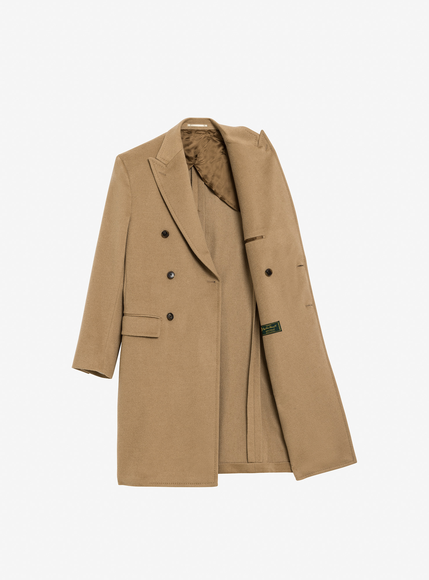 Manteau en laine Camel, boutonnage croisé à 6 boutons, montage non construit, épaules sans épaulettes, deux poches latérales à rabats, une poche poitrine classique, une fente dos, doublure intérieure complète.