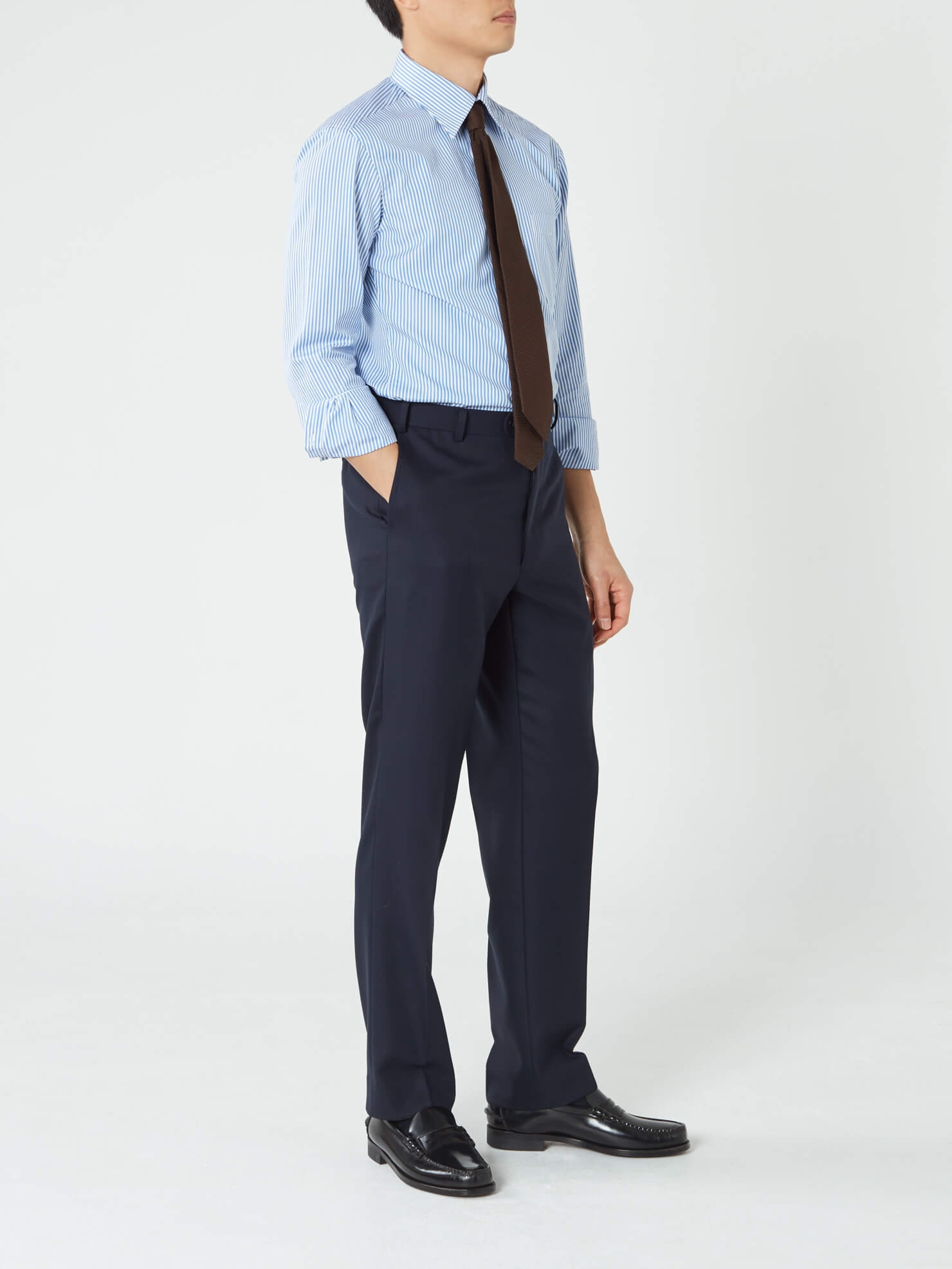 Pantalon classique en laine marine- Pantalon classique sans pli sans pince, passants ceintures, poches latérales obliques, deux poches passepoilées boutonnées à l'arrière, bas simple sans revers.